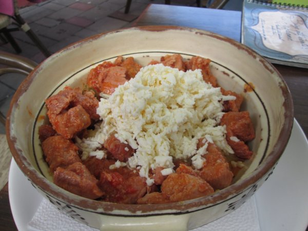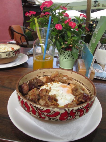 Ha már Erdélyben járunk, úgy gondoltuk, eszünk valami helyi ételt is. Az óvárosban vadásztunk egy ideig, de nem igazán találtunk kedvünkre valót.Volt, ami tetszett, de úgy tűnt, talán csak a panzió vendégei számára fenntartott (de legalábbis elég kihaltnak tűnt és azzal sem foglalkoztak, hogy beléptünk), vagy túl drágának éreztük, a főtéren pedig magyarul énekelt egy bácsi, de annyira hangos volt, hogy nem lehetett megmaradni a közelben. Így az óratorony alatti úton kimentünk, és egy kis térre érkeztünk. Ott ültünk be a Cafe Martinibe, ami bár egy olasz étterem, de a kiülős része nagyon hangulatos (még kis csobogó is van) és helyi ételeket is szolgálnak fel. A helyi specialitásból rendeltünk – románul írták a nevét, már nem emlékszünk, mi volt, de az 1-es és a 2-es lett: az 1-es Dracula valamije, ami pörköltszerű hús polentával, sajttal megszórva, a 2-es ugyancsak polentás, füstölt hússal, kolbásszal, tükörtojással. Mindkettő nagyon finom volt (nekünk kicsit túl intenzív is volt az ízük) és laktató (árban olyan 22 lej körül mozogtak), mellé pedig dinnyelimonádét ittunk.